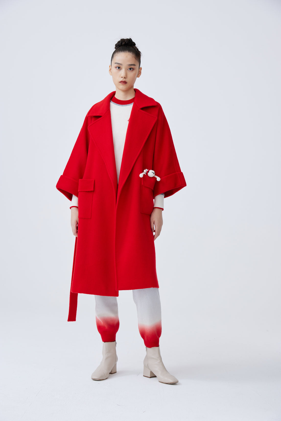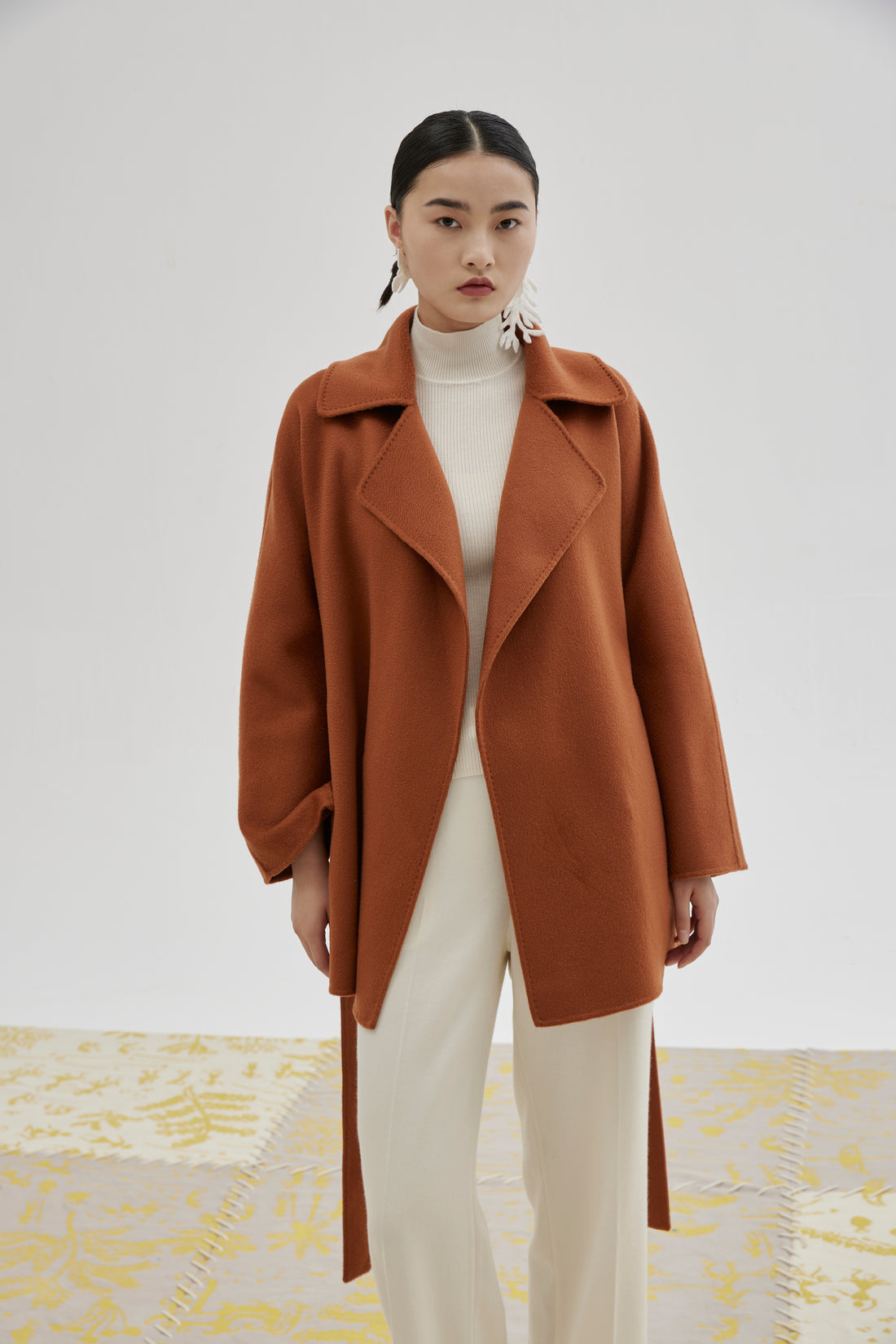 Double-faced sable cashmere, hand-sewn short cut featuring a laple collar, welt pockets. Matching belt fastening....