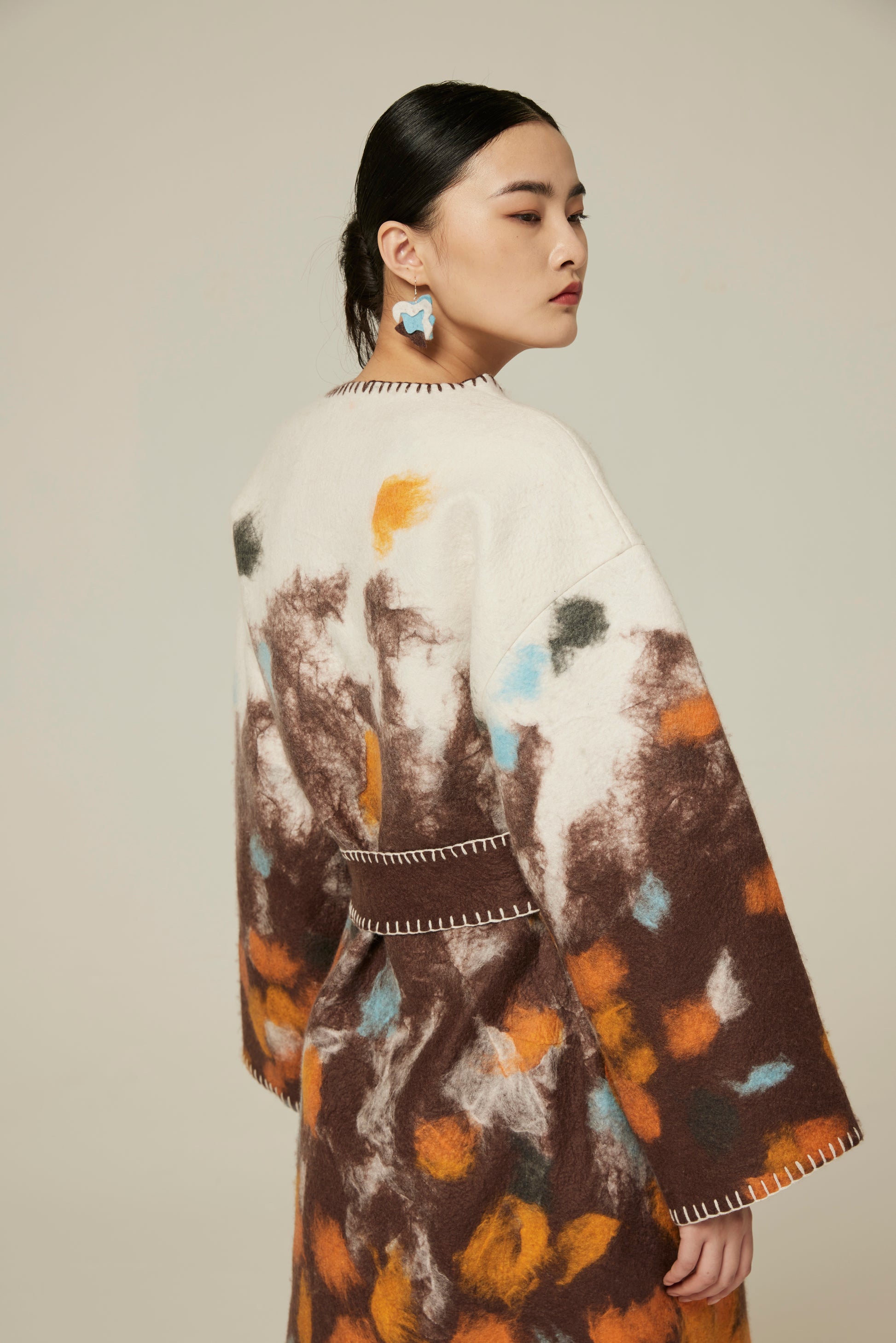 Unique handcrafted felt coat using 100% cashmere, hand-sewed hem and belted waist, an artwork by Mongolian traditional craftsmanship.