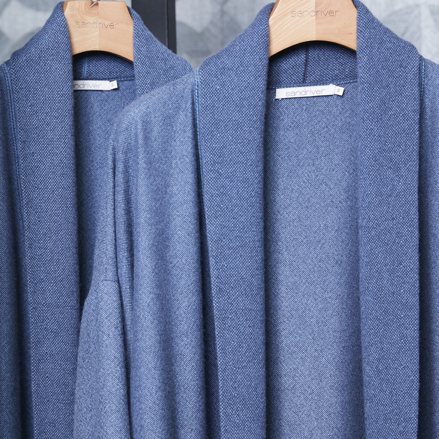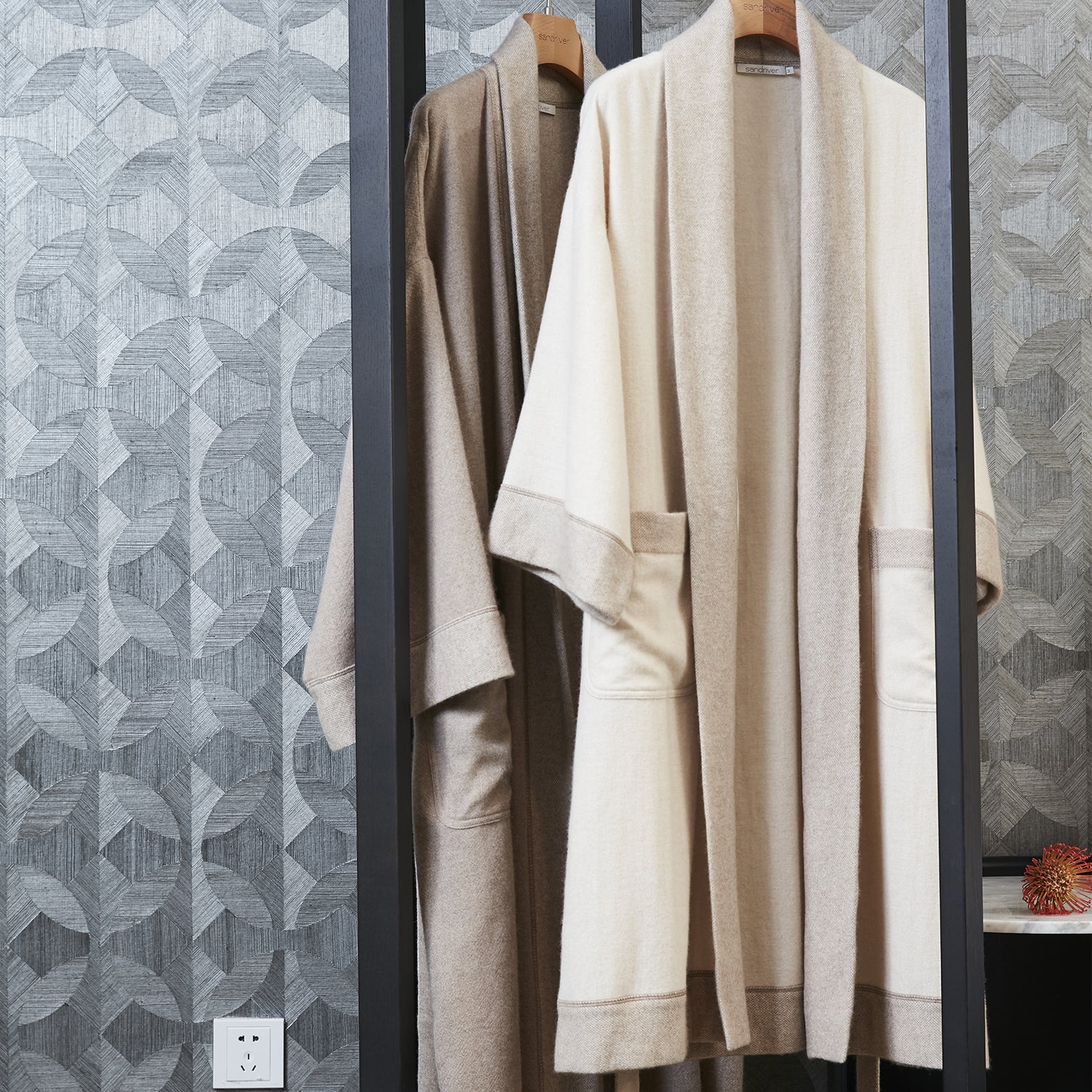 Natural un-dyed woven cashmere robe with knitted trim and patch pockets. Unlined. Fastens with matching belt.
