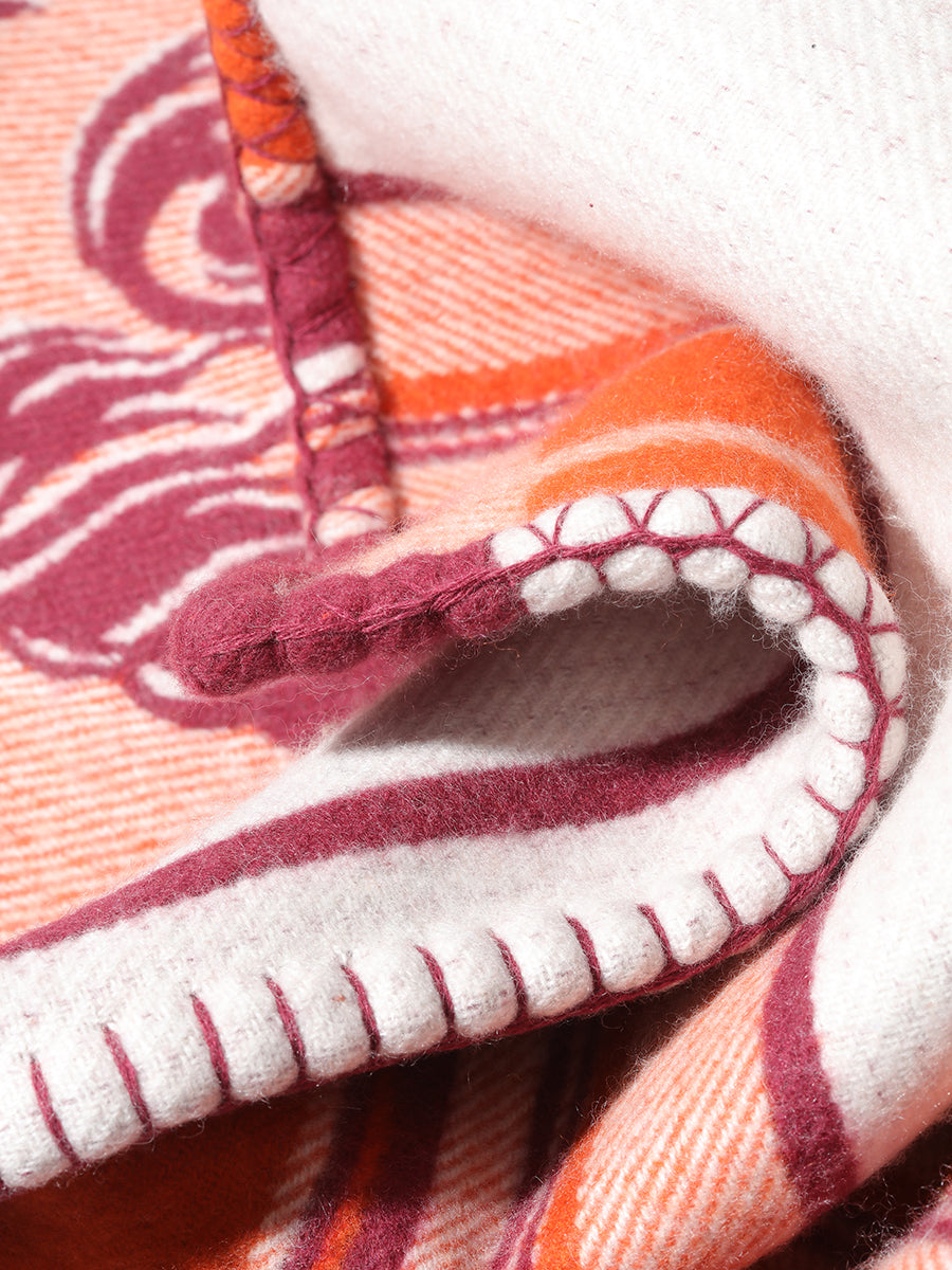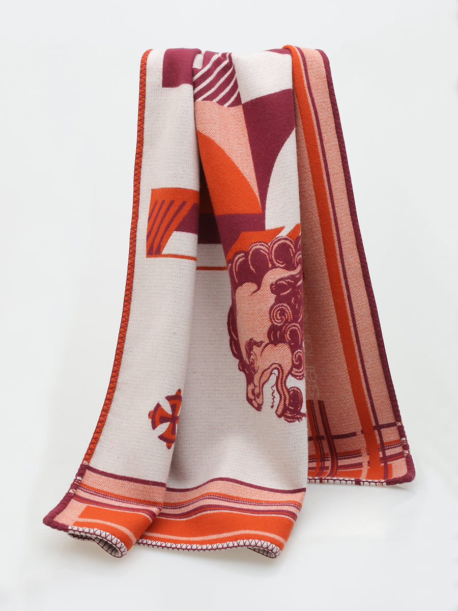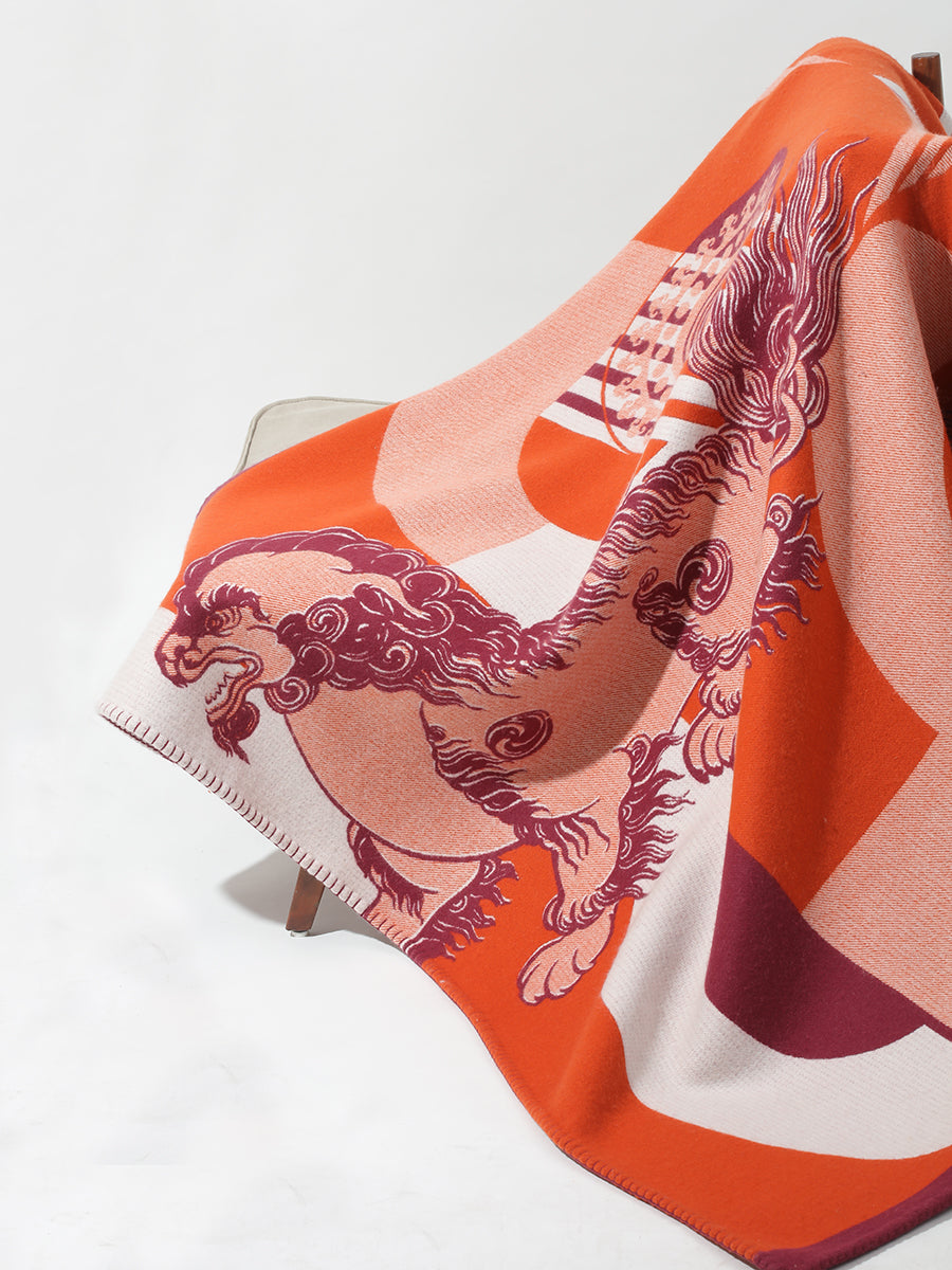 Inspired by Tibetan culture, this cashmere throw showcases a beautifully detailed jacquard-woven lucky lion. The rich burgundy and vibrant orange hues symbolize good fortune and happiness.
