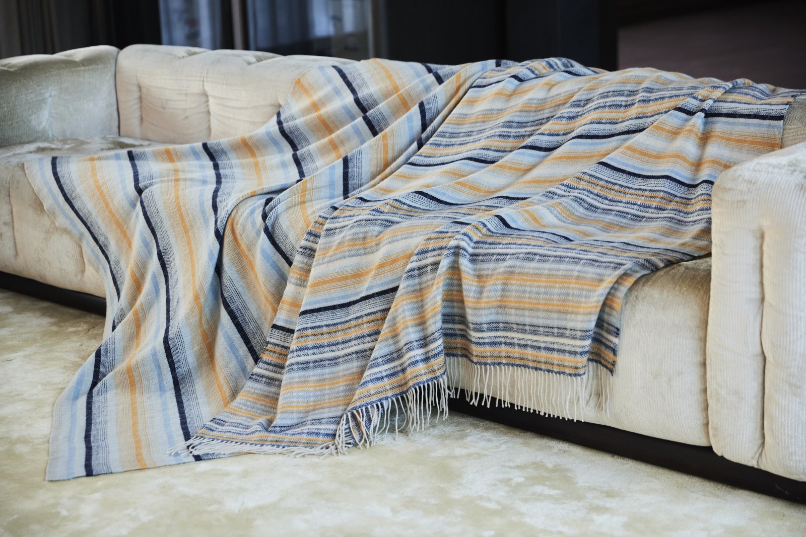 Made from very fine fibers, this blanket has a light and soft handfeel, like a second skin. It also boasts a soft luster and strong elasticity.