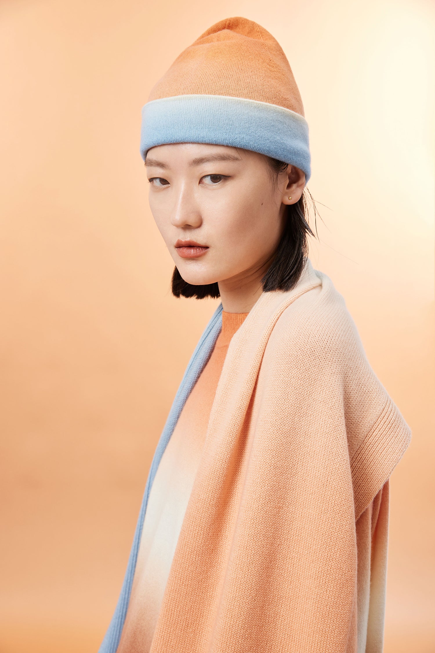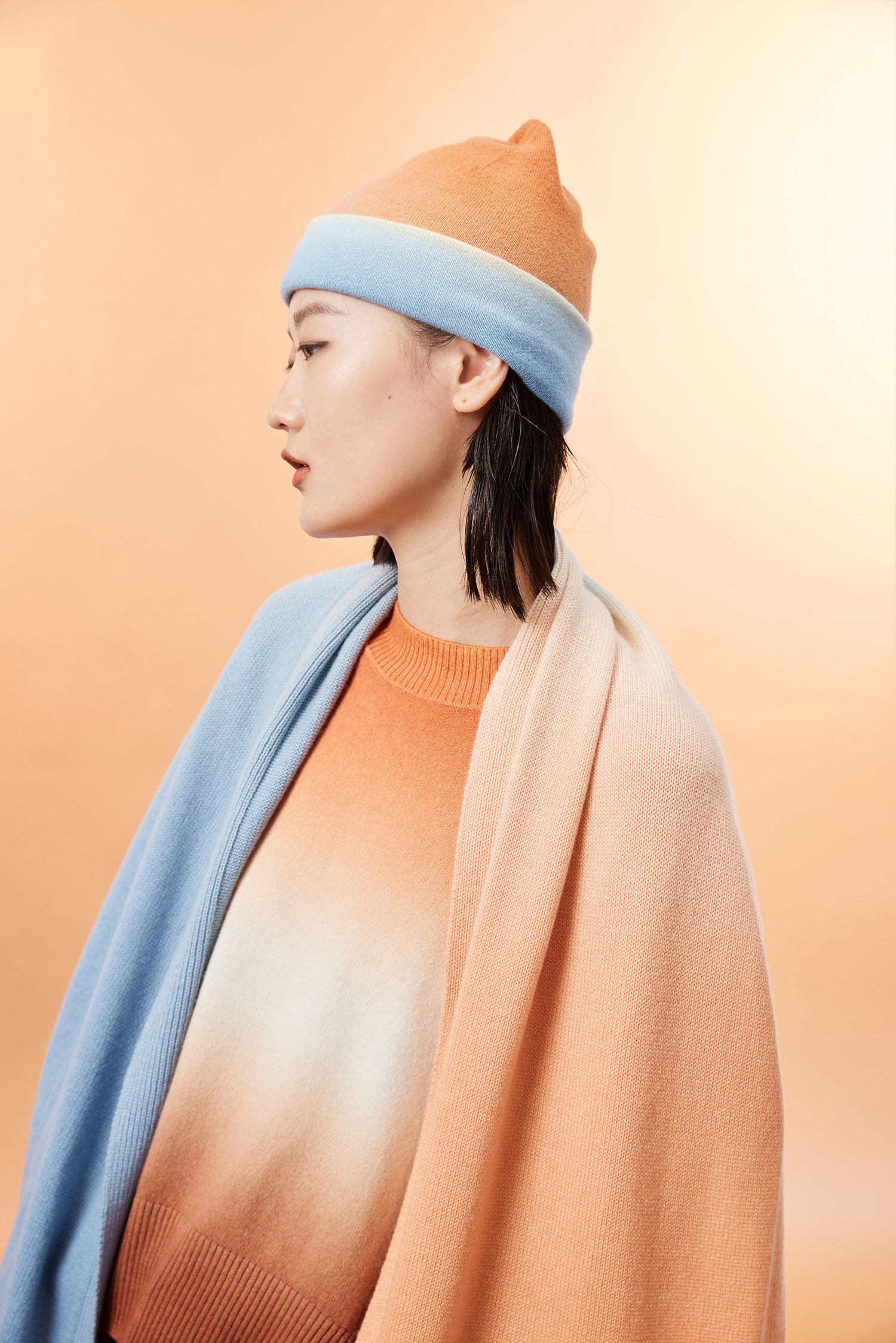 100% cashmere two-sided gradient worsted hat, warm and casual with handmade dip-dye.