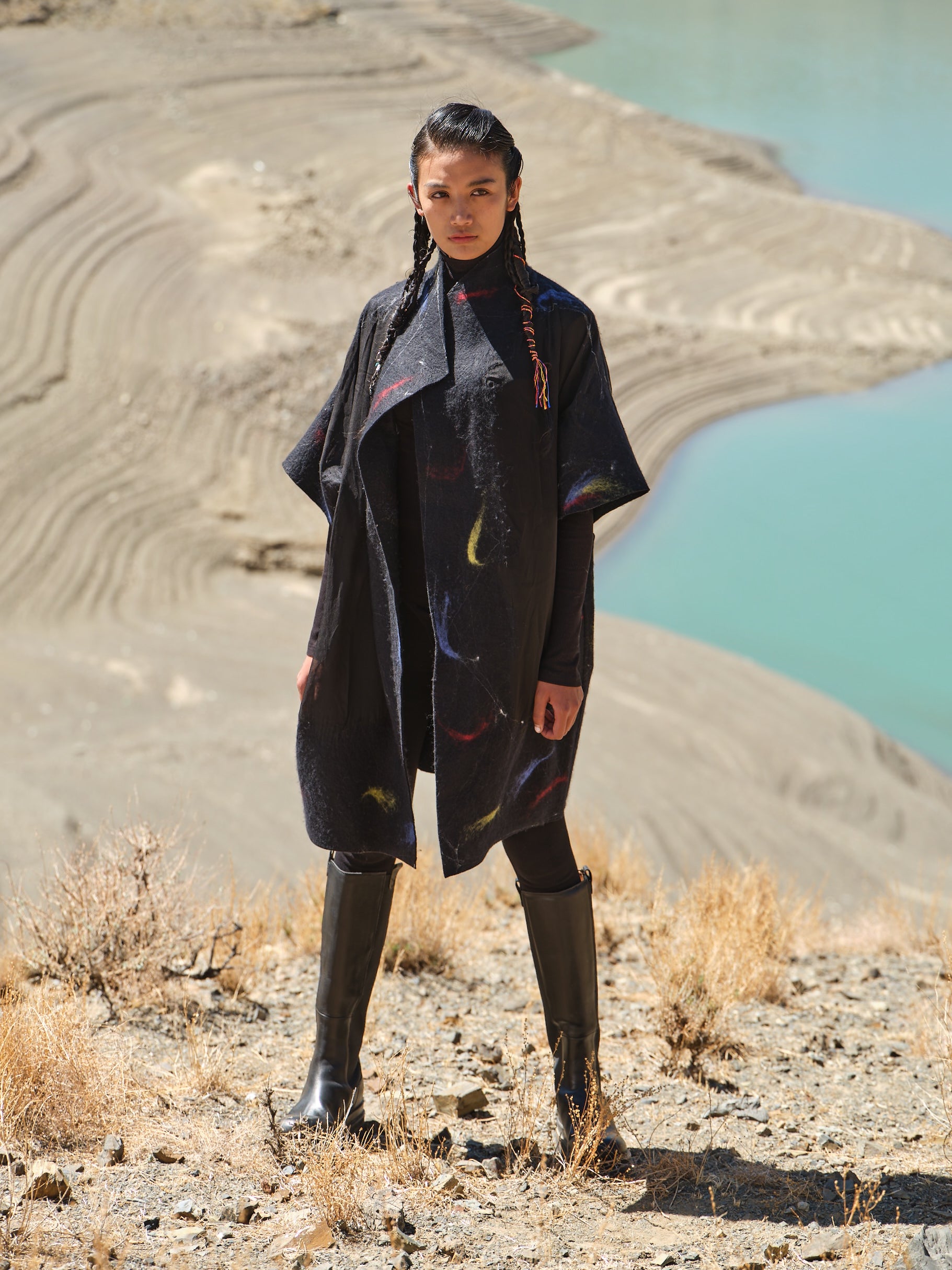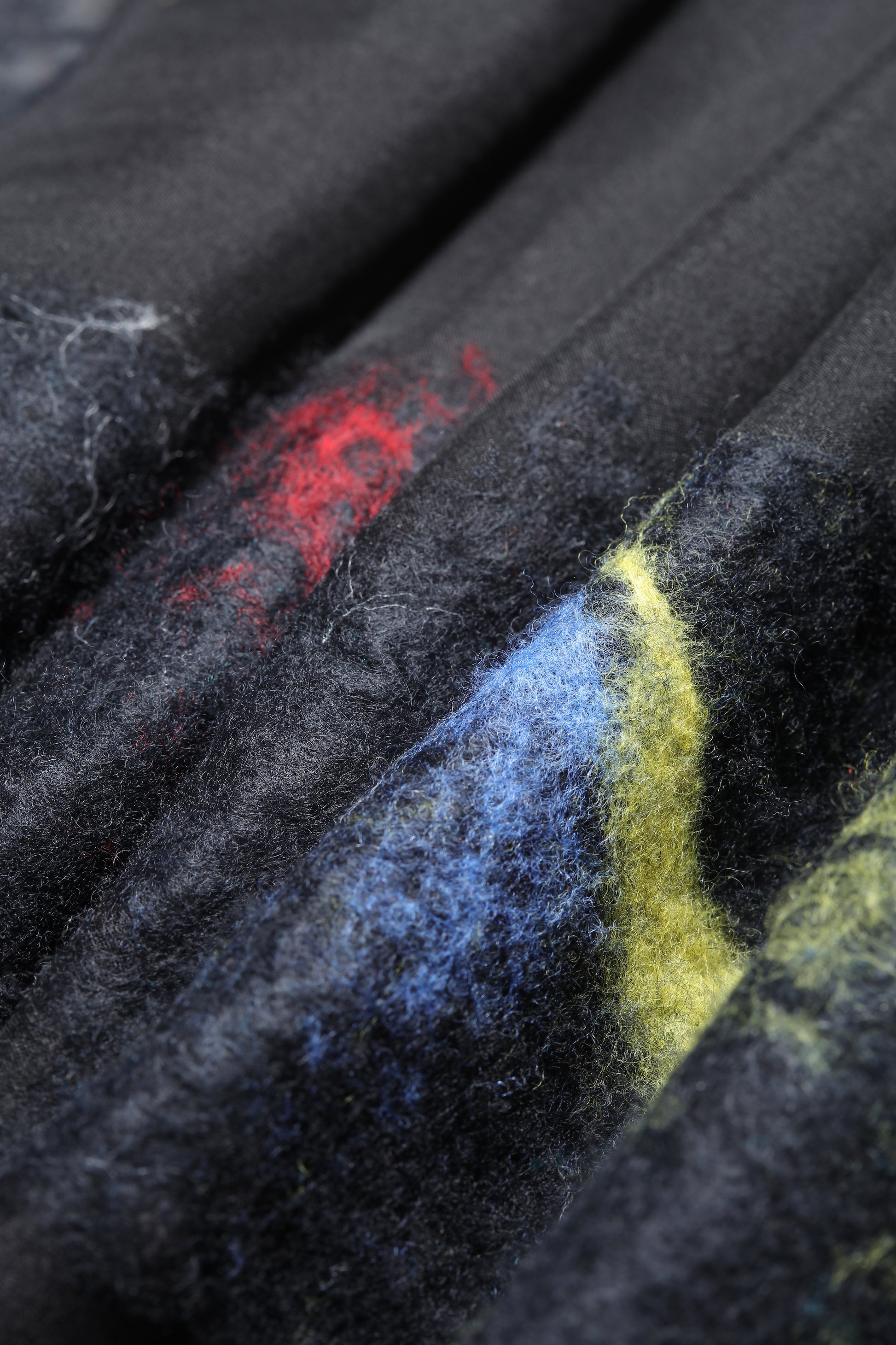 Unique tradital monglian handcrafted cashmere felt on top of silk-cashmere fabric. Decorated by colored cashmere randomly that com e from the wasted material during the production of the entire collection. An artistic handcraft with idea of sustainable fashion.