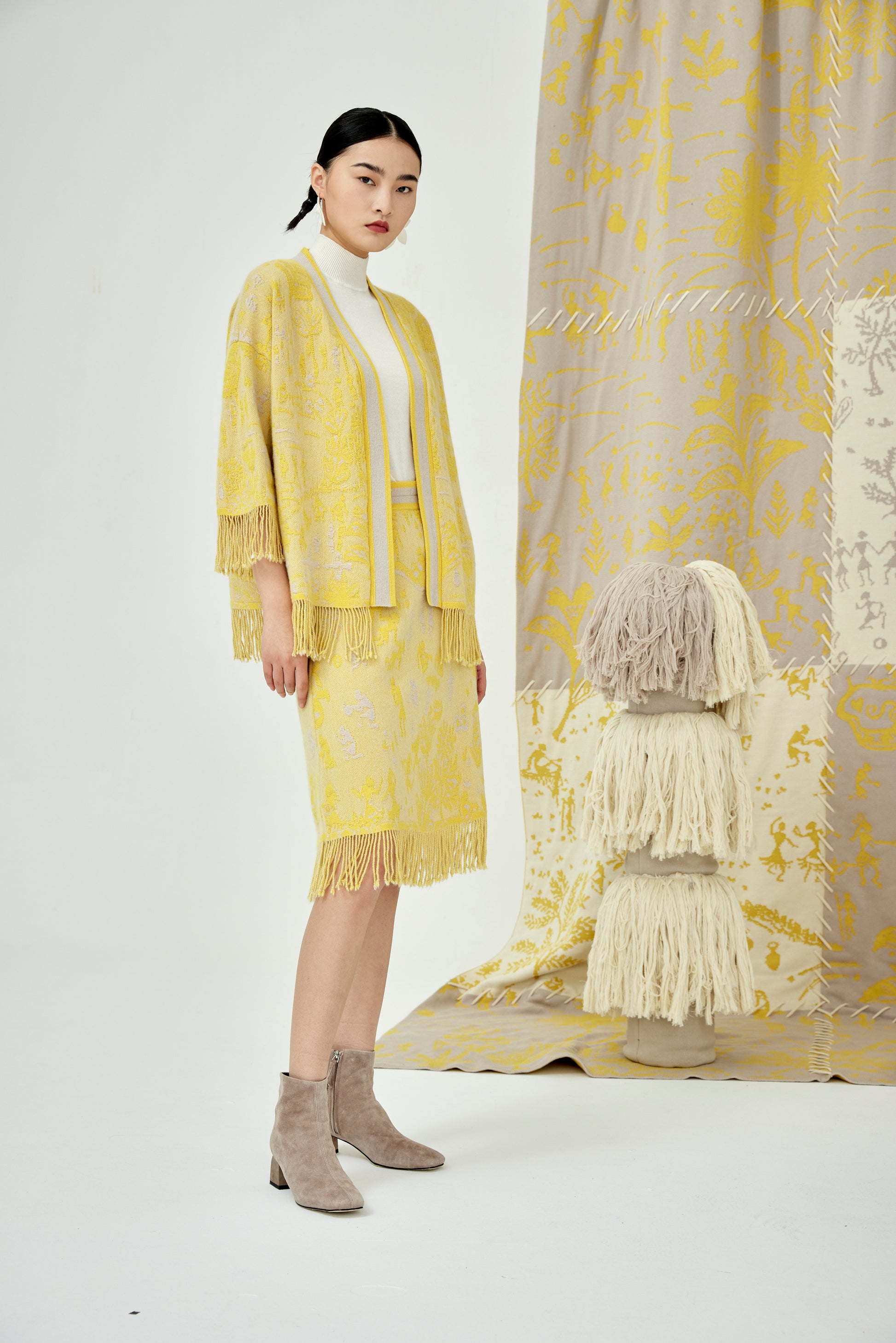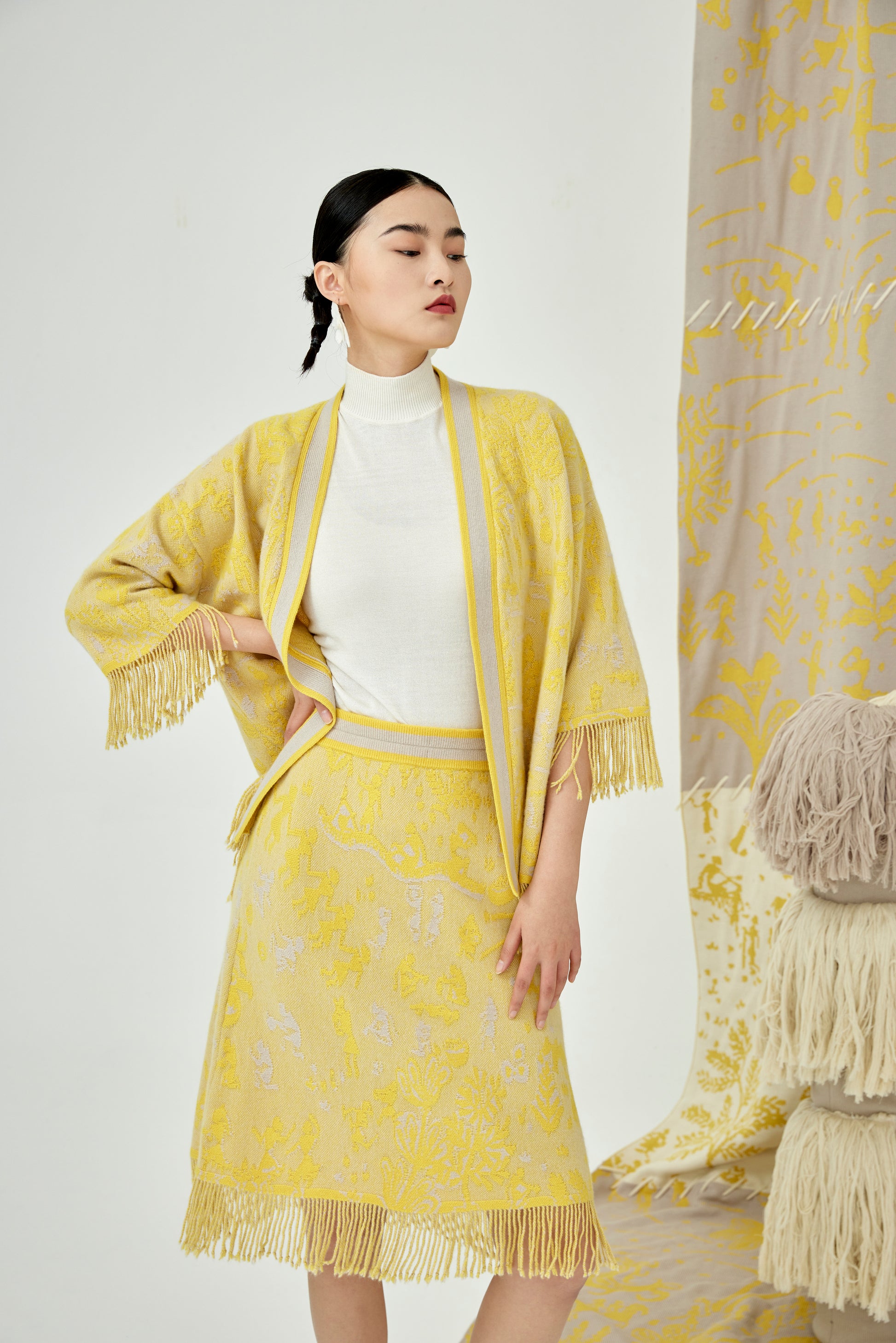100% cashmere skirt featuring handcrafted tasseled edge, jacquard pattern comes from traditional Chinese phoenix, knee-length, elasticated waistband.