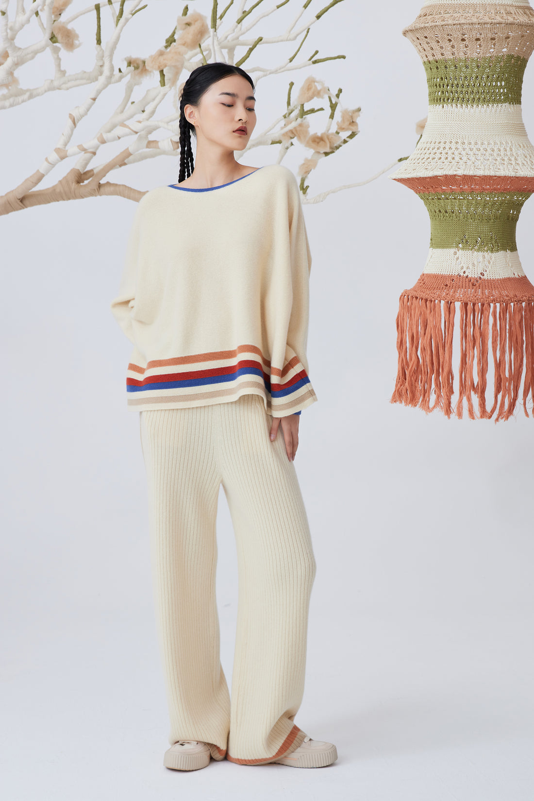 100% cashmere ribbed-knit trousers with elastic waist and colored side strips.From family-owned cashmere ranch and...
