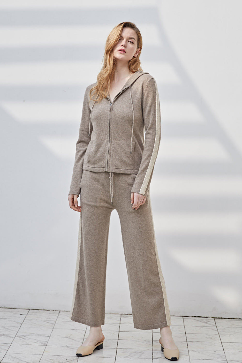Zipper un-dyed woman's cashmere cardigan with drawstring hood / Straight-fit casual cashmere trousers