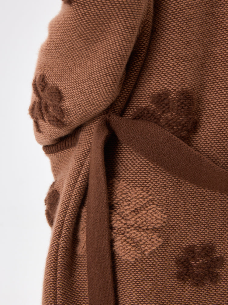 Selected cashmere knitted fabric, with a terry exposed jacquard technique featuring a Gesang flower pattern, presenting a three-dimensional texture with distinct raised petal patterns, and the underlying terry is faintly visible. The placket is designed with thick terry, which is thick and full