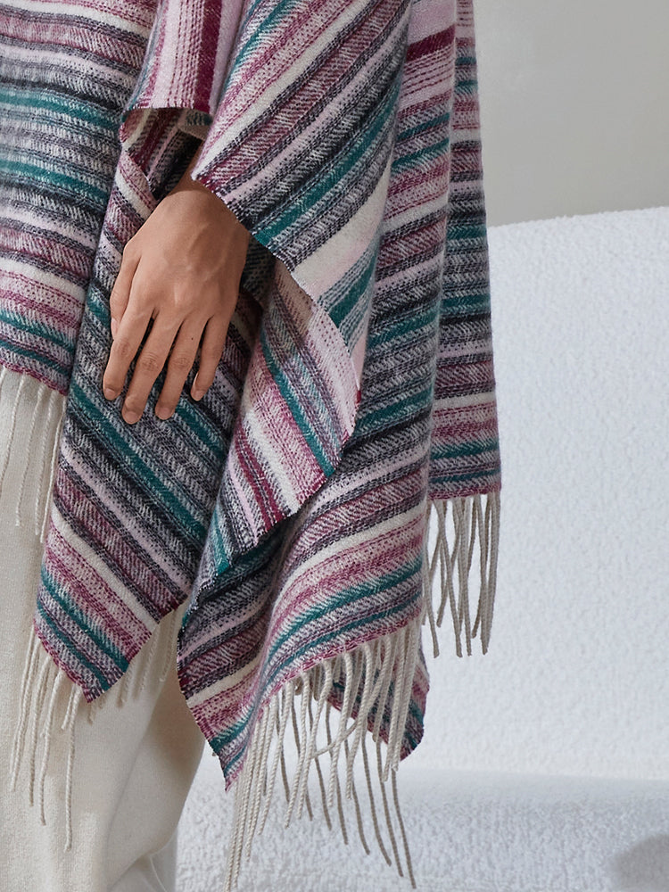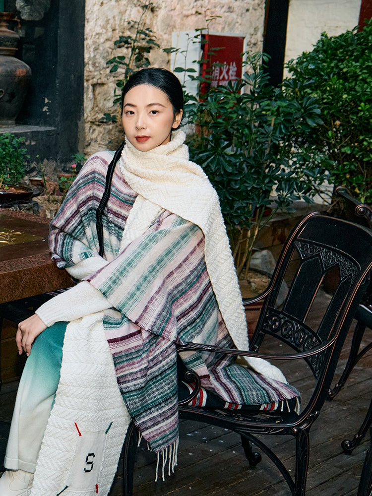 Derived from high-quality cashmere from family ranches in Inner Mongolia and from pastures in Xizang at an altitude of 5000 meters, as well as high-quality yak hair from Guoluo in Qinghai, the one-piece collar cloak style is highly inclusive, not particular about body shape or wearing style, allowing for free and casual draping
